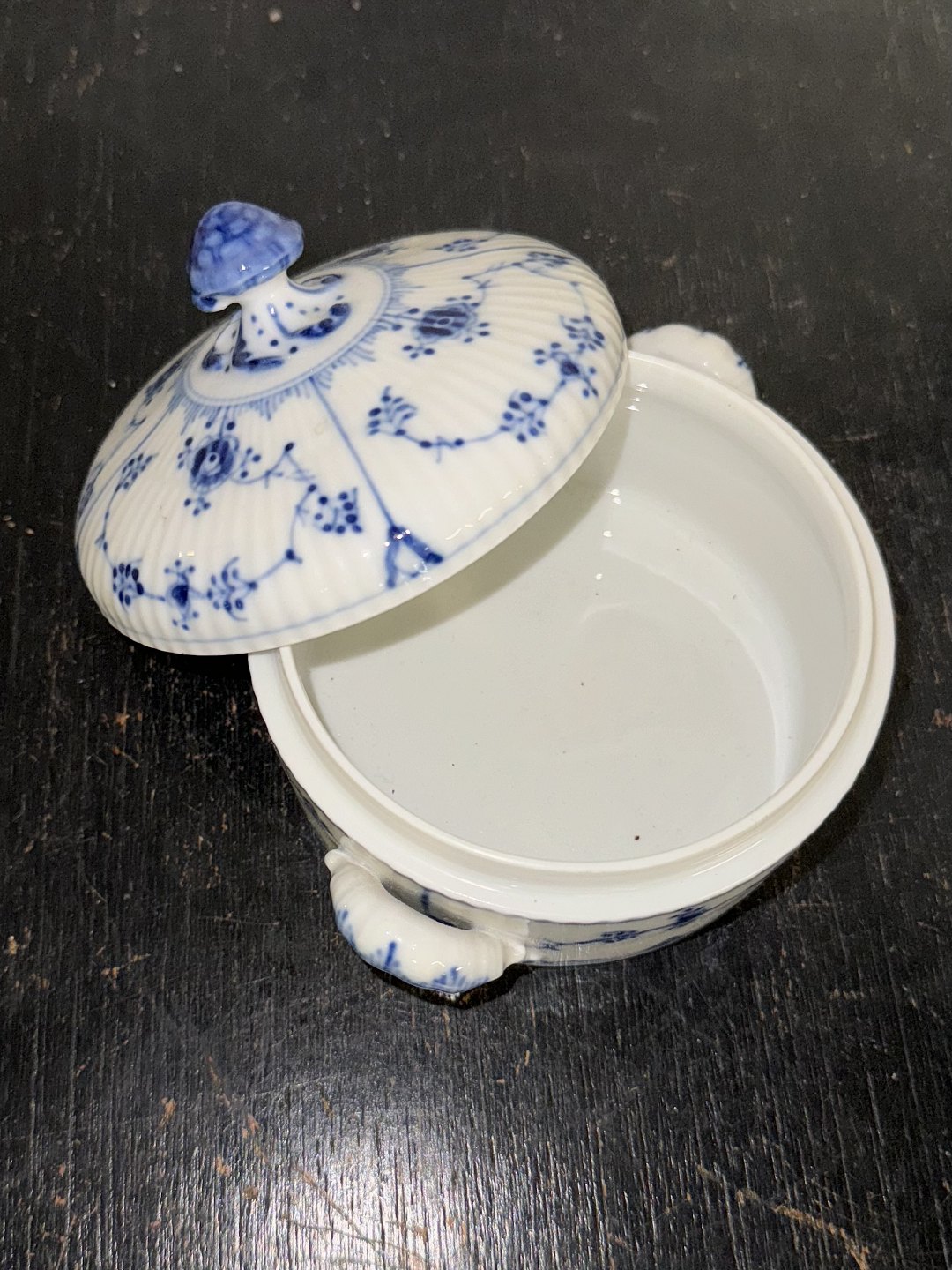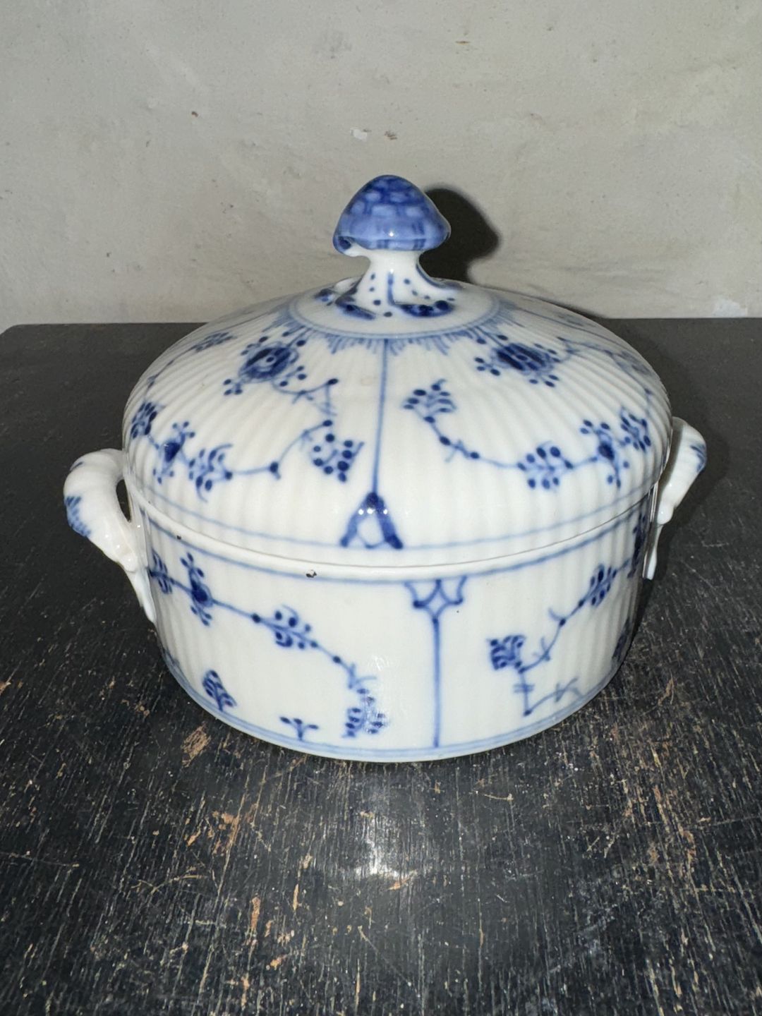 Musselmalet, riflet, smørskål eller sukkerskål i porcelæn fra Royal Copenhagen. Fremstår i perfekt stand. 1. sortering. Ingen skader eller reparationer. Fabriksmærket på bunden samt på undersiden af låget.Mål H. 9 cm ø. 14