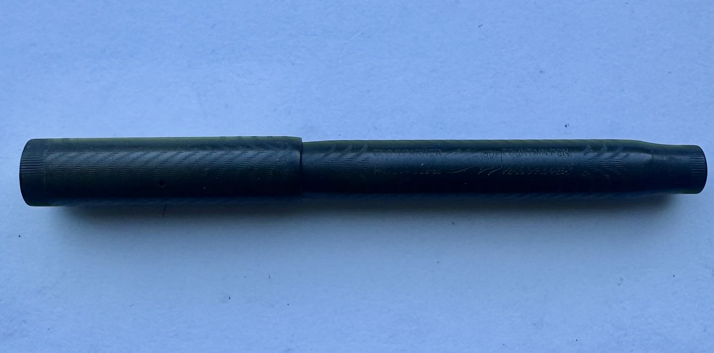 Sort Parker “Jack-Knife” Safety Lucky Curve fyldepen fra begyndelsen af 20. århundrede. Fungerer ikke. Der skal indsættes ny gummisæk før fyldepennen igen kan optage blæk og skrive igen. Fremstår i god stand. Dog mangler clip’en øverst på hætten. Fyldepennen er 13,5 cm lang.