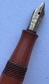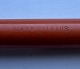 Koralrød Waterman nr. 52 fyldepen med leverfiller. FEJL: Mavebælte på hætten mangler og der er en revne henover “tråden” på pennens krop (se foto med den grå pil). Mål: 13,5 cm lang.