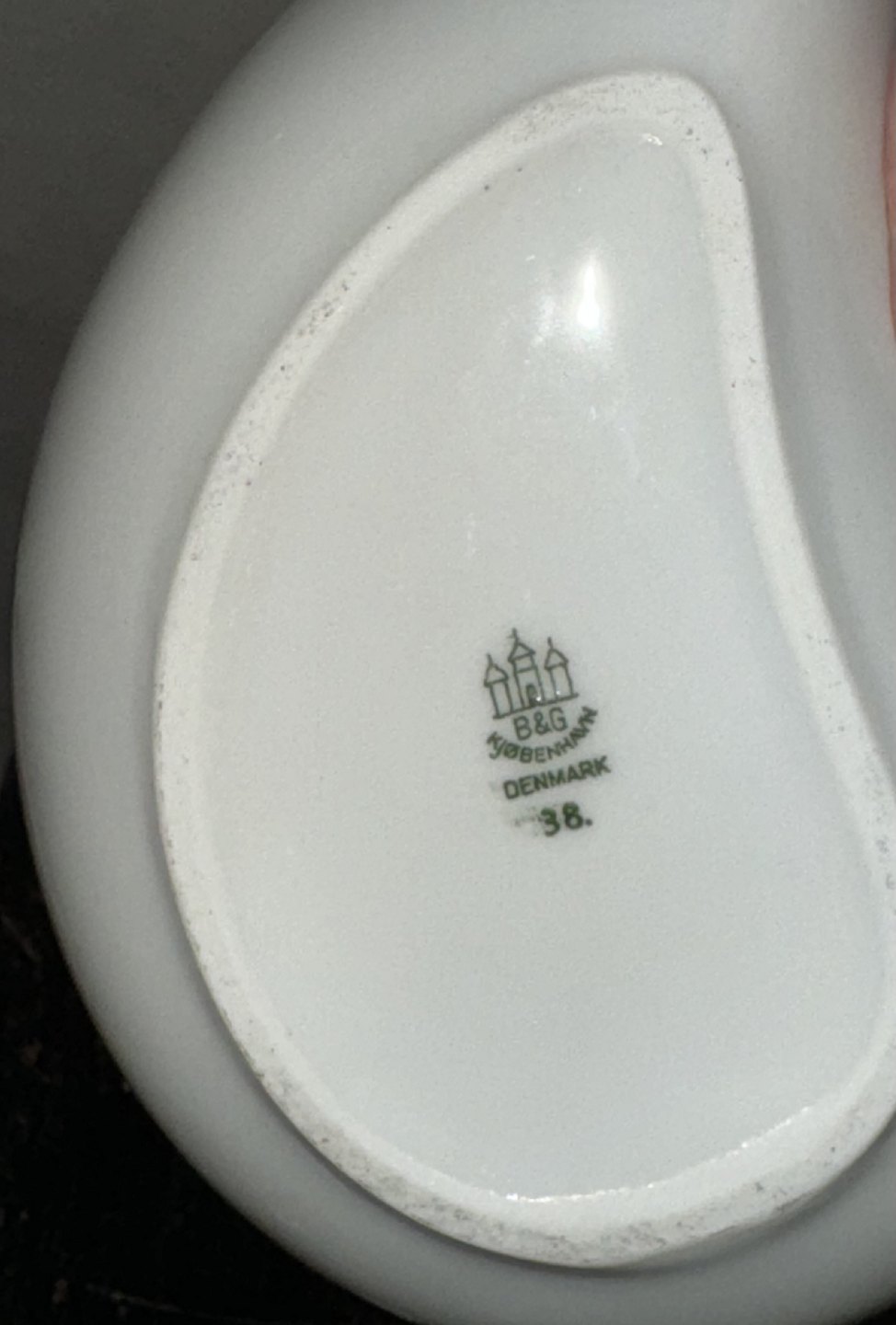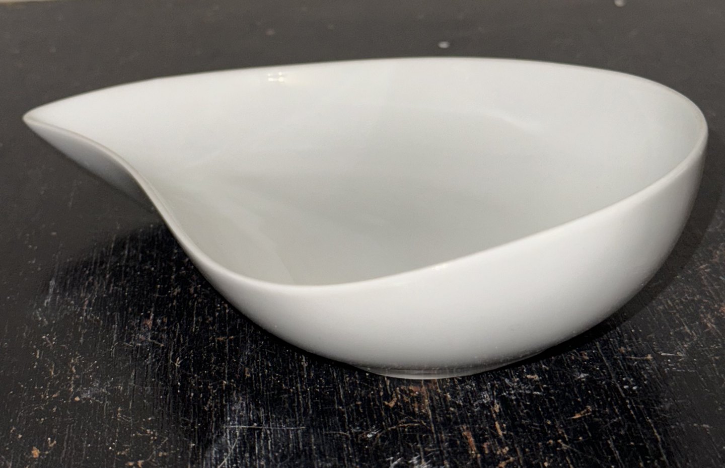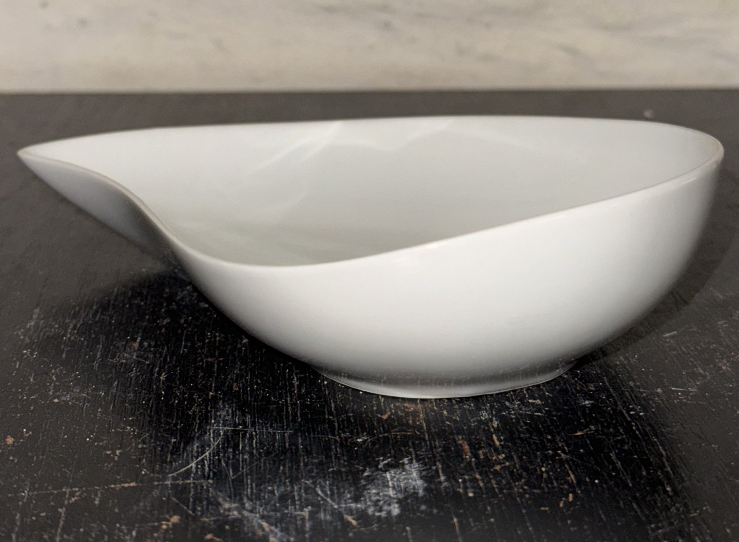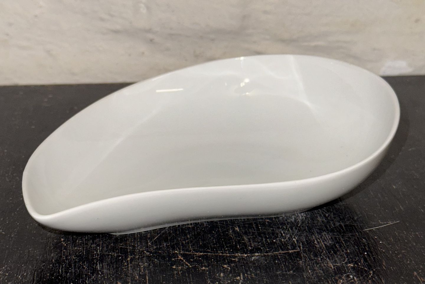 HENNING KOPPEL: Nyreformet skål i hvidt porcelæn fra Bing og Grøndahl. Fremstillet på B&G fabrikken. I god stand. Ingen skader eller reparationer. 1.sortering. Fabriksmærket på bunden sammen med modelnummer 38. Mål: H. 4,2 cm L. 16,4’cm B. 12 cm