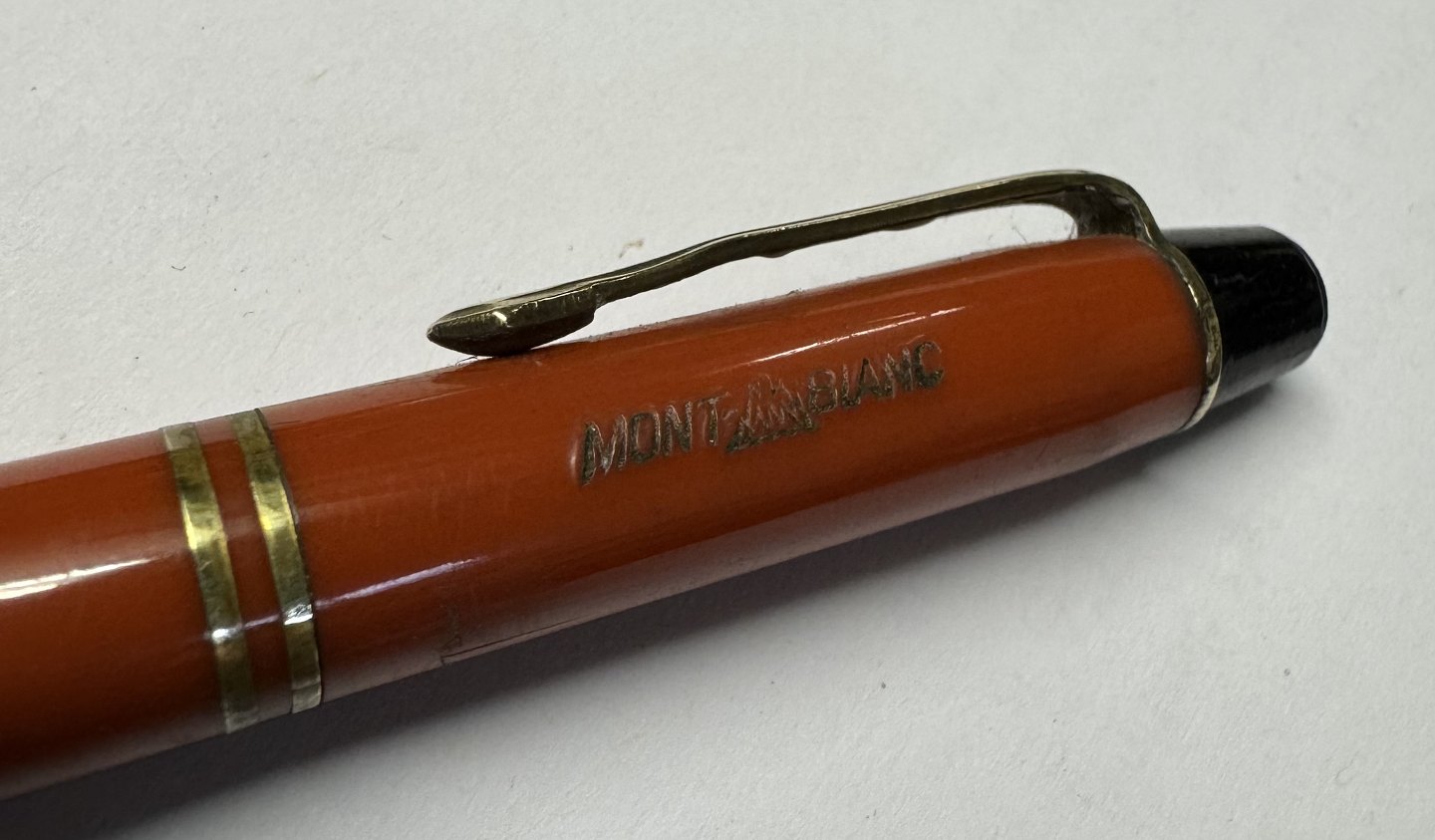 Slank vintage koralrød Montblanc 33 skrueblyant fra omkring 1950. I fin stand uden skader. Mindre ridse ( se foto med grå pil). Klar til at blive brugt. 12,8 cm