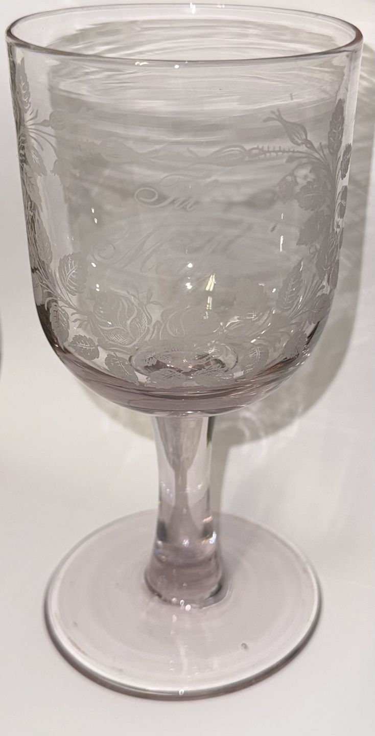 Gammelt dansk vin glas fra Kastrup Glasværk i form af erindringsglas fra ca. 1910. Fremstår i god stand uden skader eller reparationer med teksten: "Til Moder". H. 16 cm