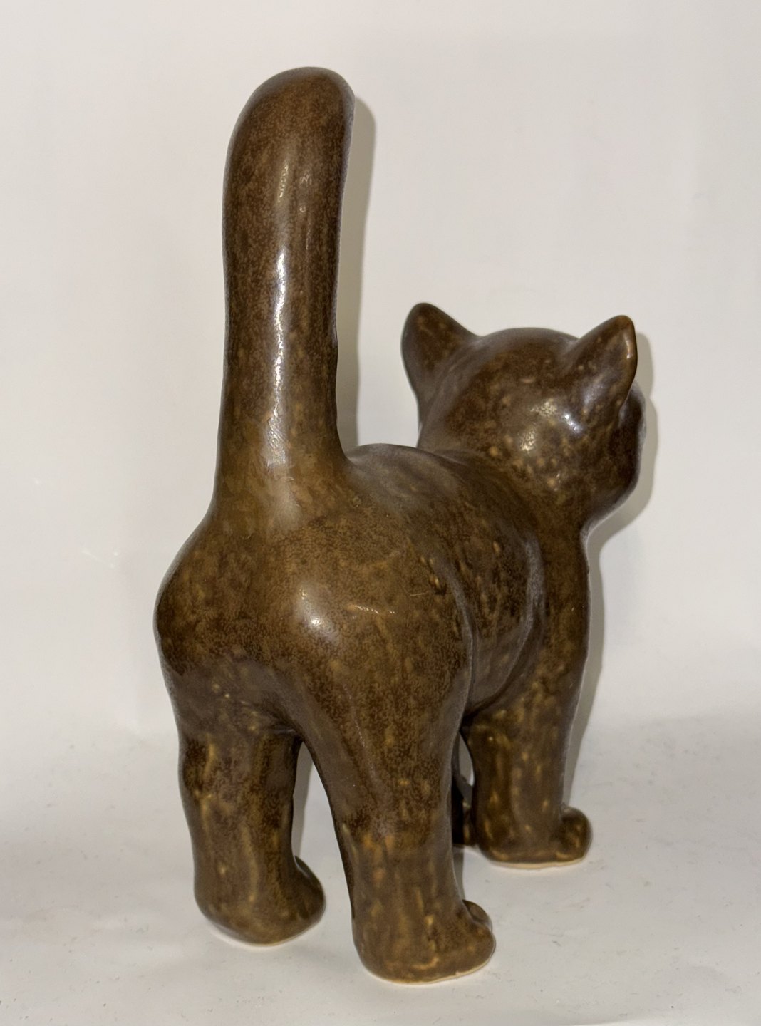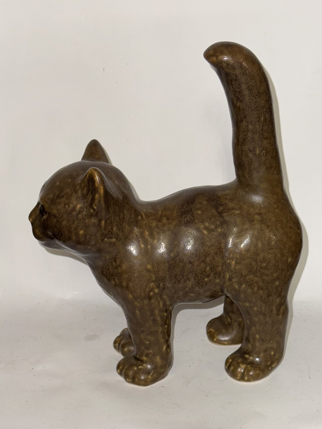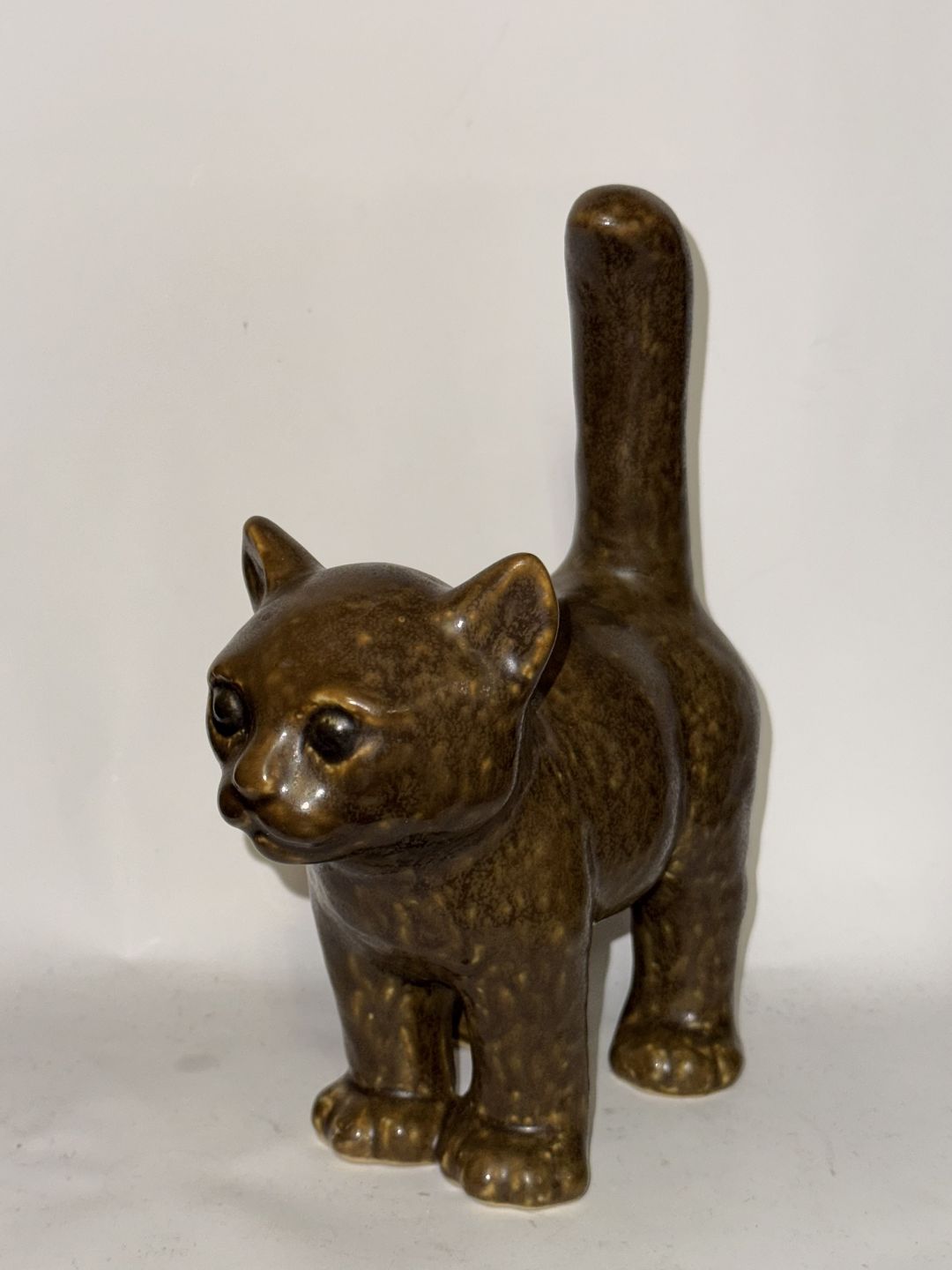 Figur i keramik udført af Knud Basse (1916-1991) på sit værksted i Vang på Bornholm. Brun glaseret. Fremstår i god stand. Signeret med KB. Mål: H. 22 cm L. 17 cm B. 7,5 cm