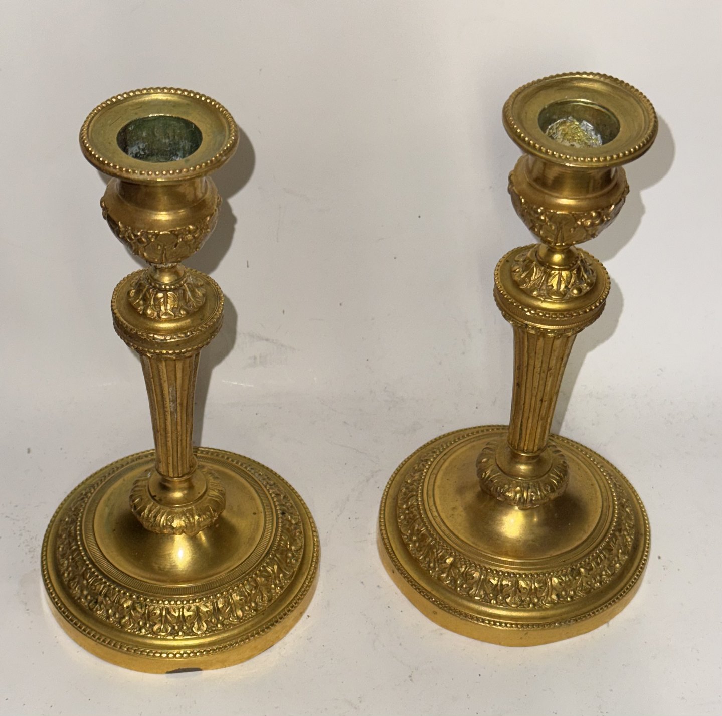 Par forgyldte lysestager i bronze. Fremstillet i Frankrig i første halvdel af 19. Århundrede. Fremstår med lidt brugsspor dog uden skader eller reparationer. H. 18,5 cm