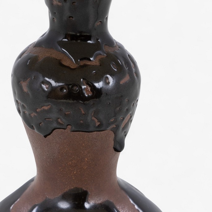 Bordlampe i stentøj dekoreret med rødbrun glasur og olivin-glasur med ny plisseret skærm. Formgivet i 1944. Signeret.