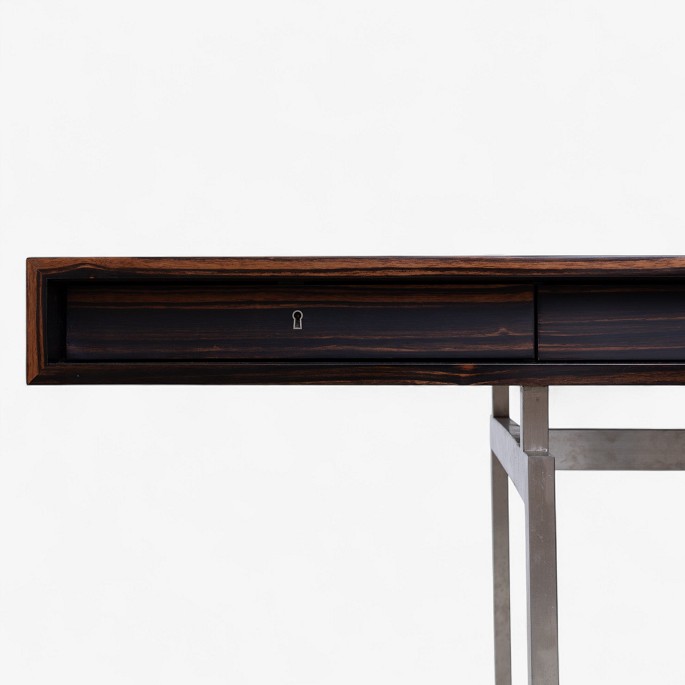 Skrivebord i valnød med fire skuffer, skuffemodul på hjul og stel i stål.