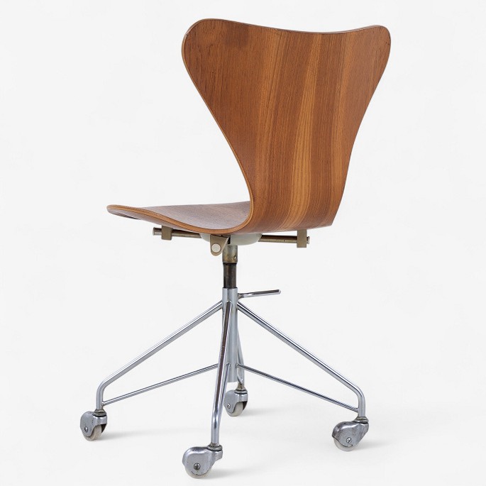 AJ 3117 - 'Seven' office chair in patinated teak on an old frame with height adjustment. Manufacturer's stamp.