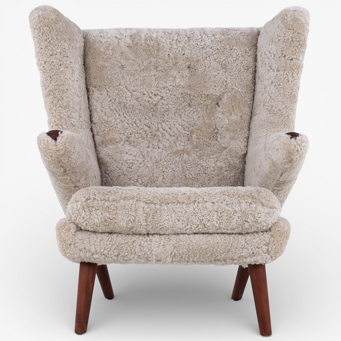 AP 19 - Newly upholstered Teddy Bear chair in lambskin (color: Moonlight) with stool.