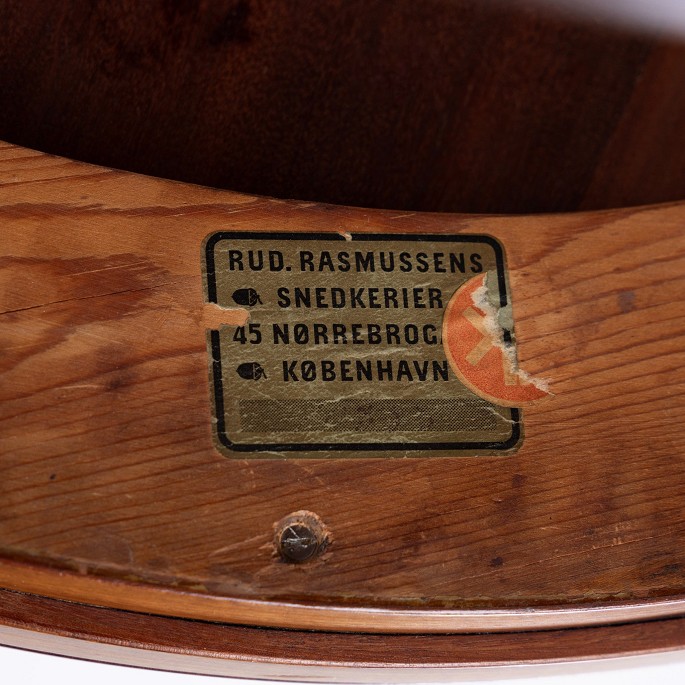 Round coffee table in patinated mahogany with underlying shelf. Manufacturer's mark.