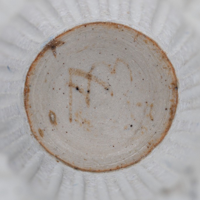 Lille, riflet vase i stentøj med hvid glasur. Signeret.
