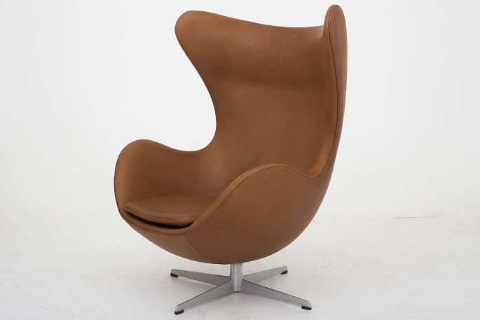 AJ 3316 - Nybetrukket "Ægget" i KLASSIK Cognac-læder med gammel fod. Vist med læderfedt.