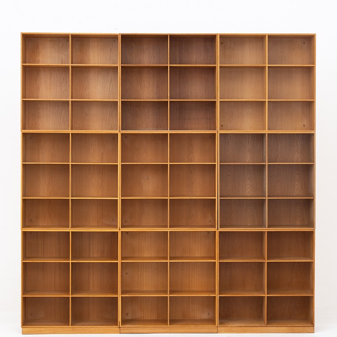 Sæt på fire bogkasser i patineret, massiv egetræ på 2 sokler.