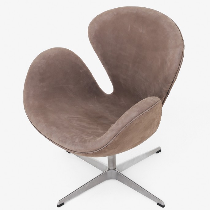 AJ 3320 - Nybetrukket 'Svanen'-lænestol i Royal Nubuck-læder (farve: Cinnamon) på ny fod af aluminium. KLASSIK tilbyder Svanen i læder efter eget valg. Kontakt os venligst for mere information.