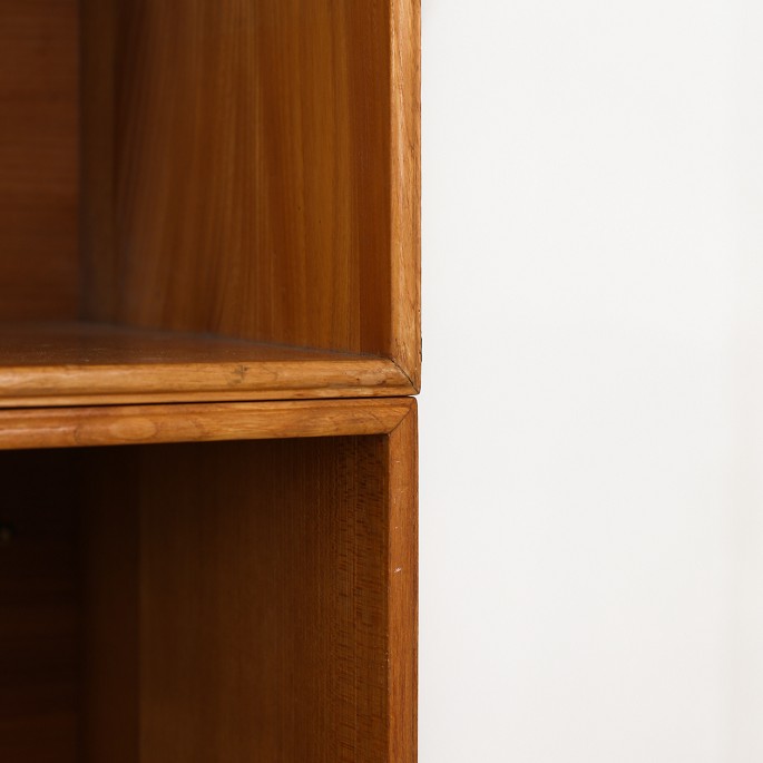 Sæt på tre skabe og seks bogkasser i patineret, massiv elm på tre sokler.