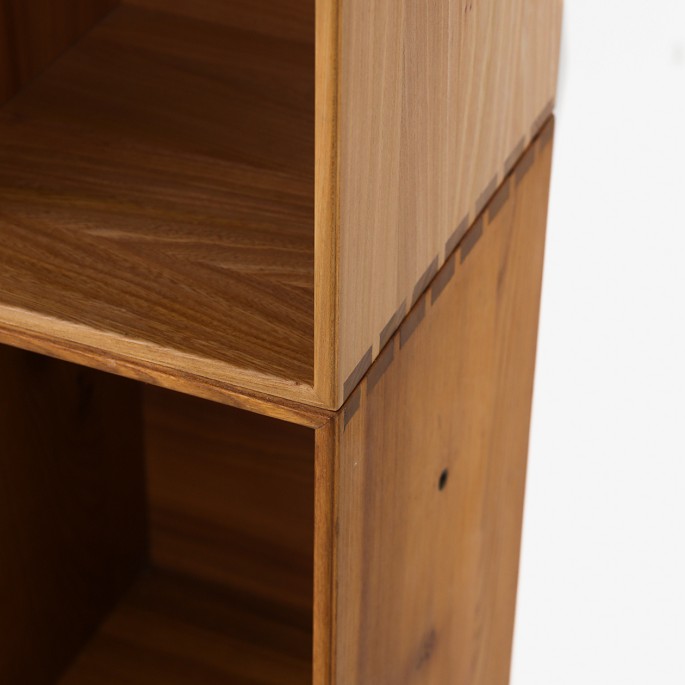 Sæt på fire bogkasser i patineret, massiv elm på to sokler.