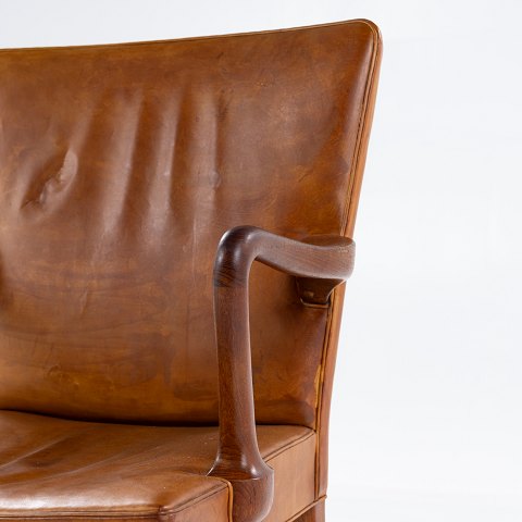 Armstol i massiv teak og originalt, patineret naturlæder.