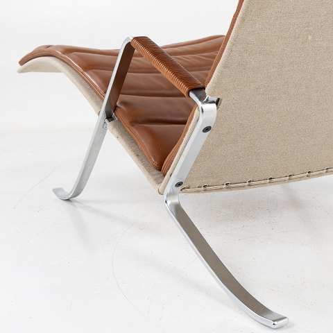 FK 87 - 'Grasshopper'-lænestol/chaiselong i cognaclæder og forkromet stål. Formgivet i 1965.