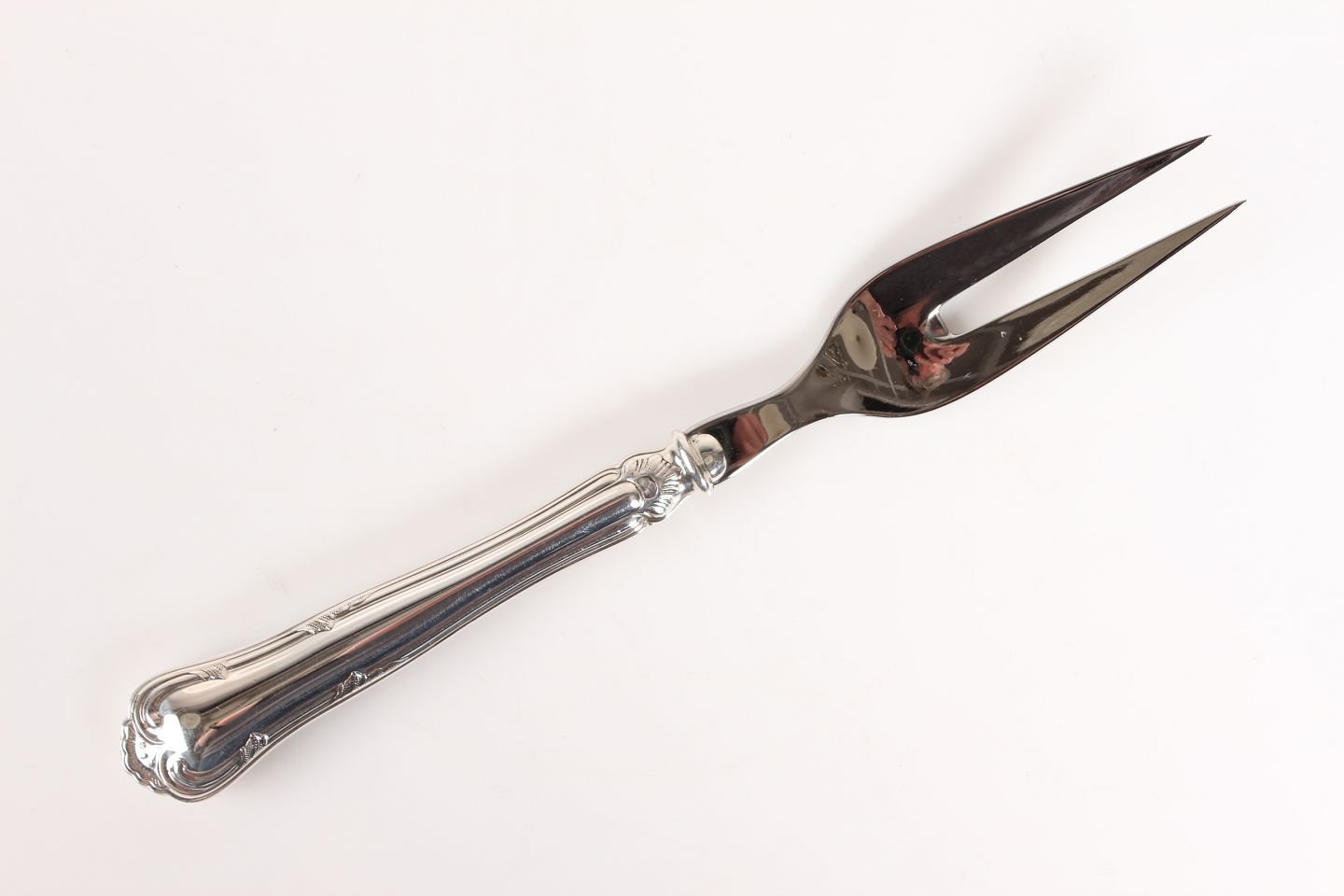 Herregaard Sølvbestik fra C. M. Cohr eller Gense Stegegaffel med stål montering Længde 23 cm Fin stand efter almindelig brug uden indskription