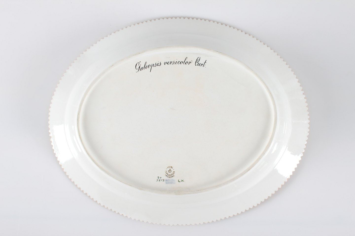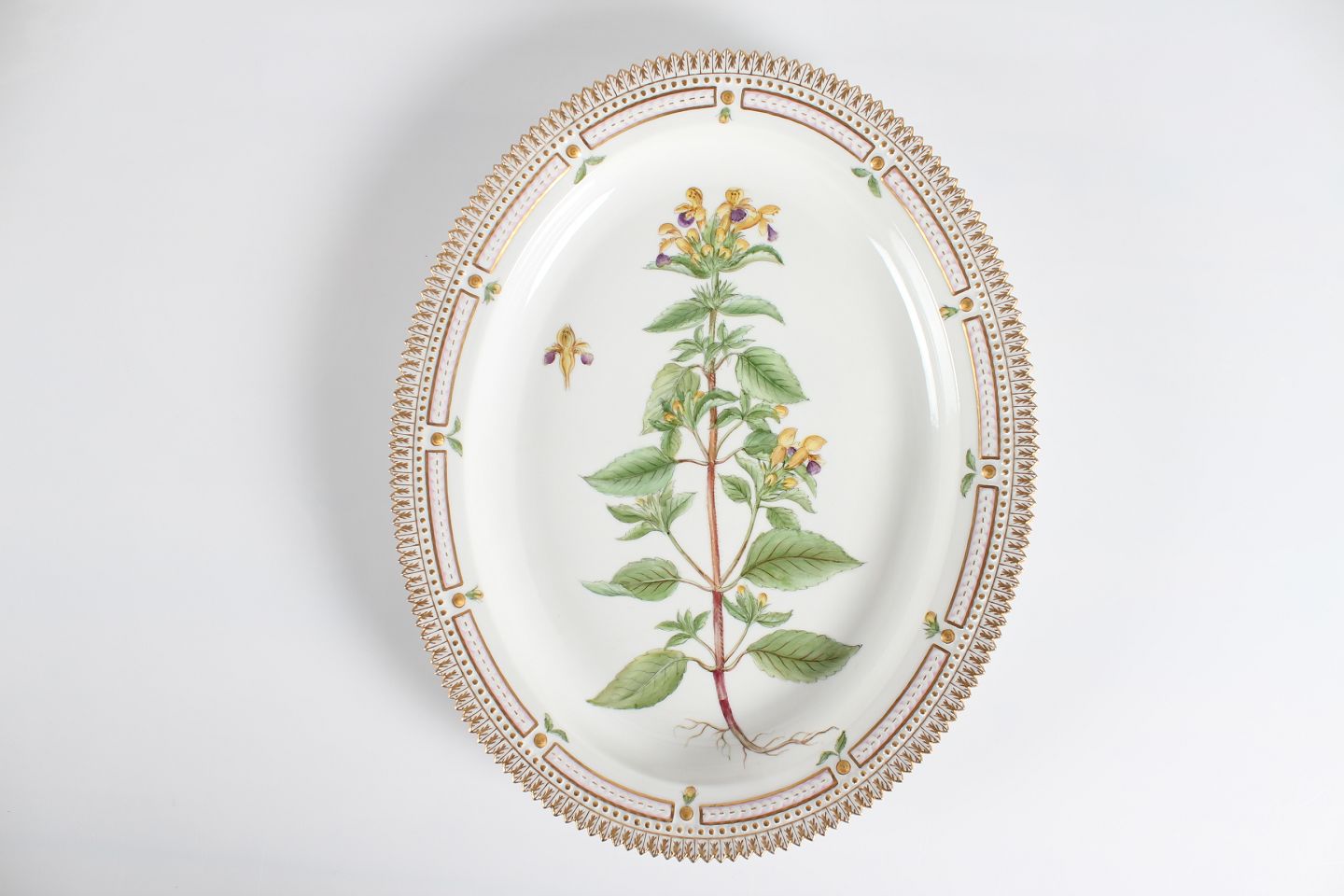 Royal Copenhagen Flora Danica Stort ovalt serveringsfad 3517 dekoreret med blomster og guld kanter "Galeopsis Versicolor Curt." Med stemple fra år 1946 Længde 36 cm Bredde 29 cm Fin fejlfri 1. sortering