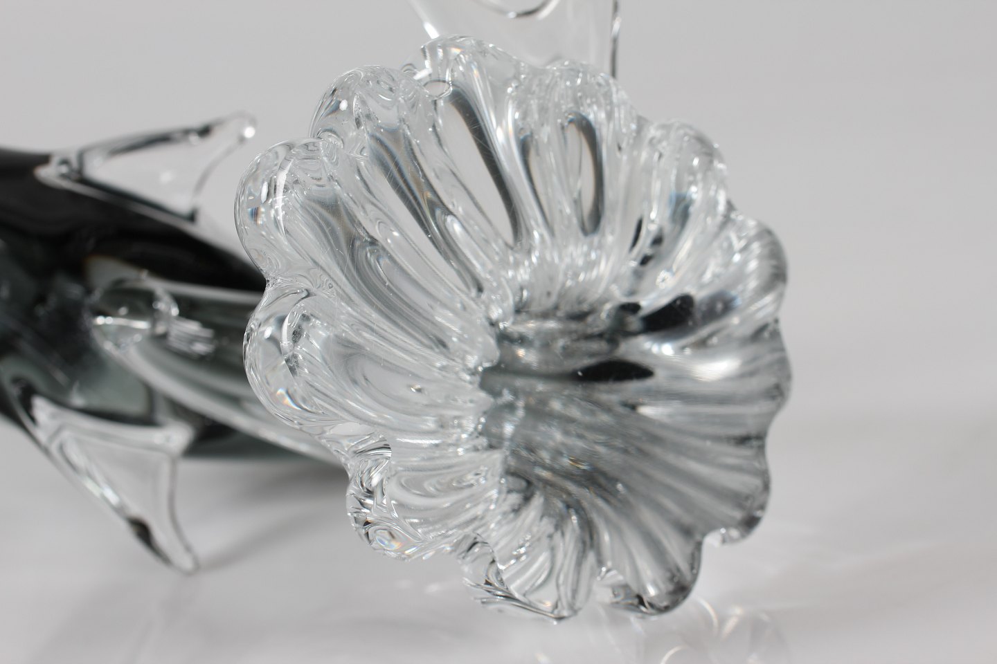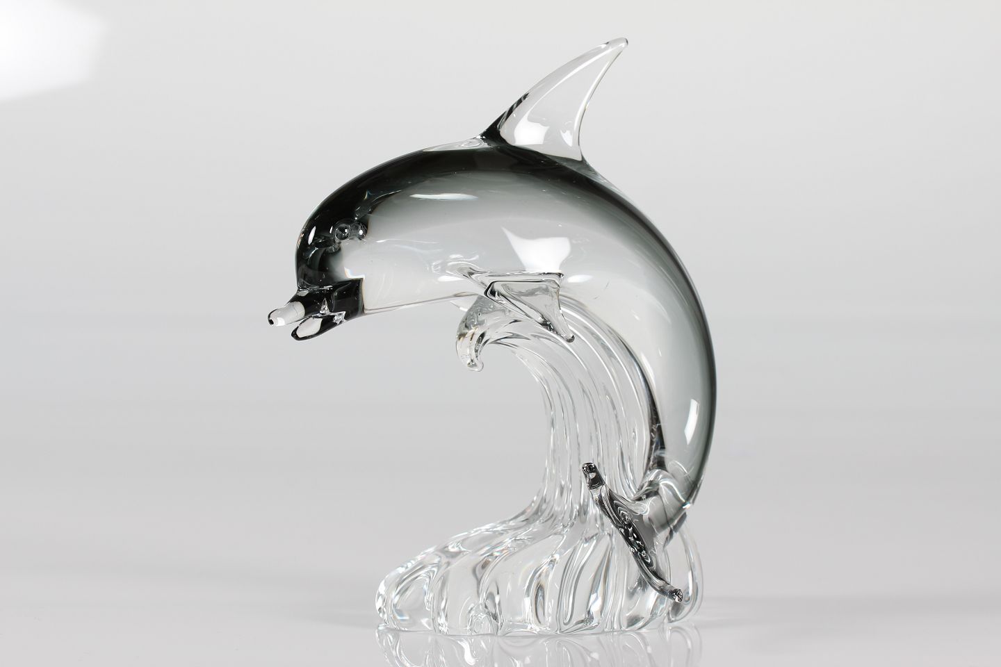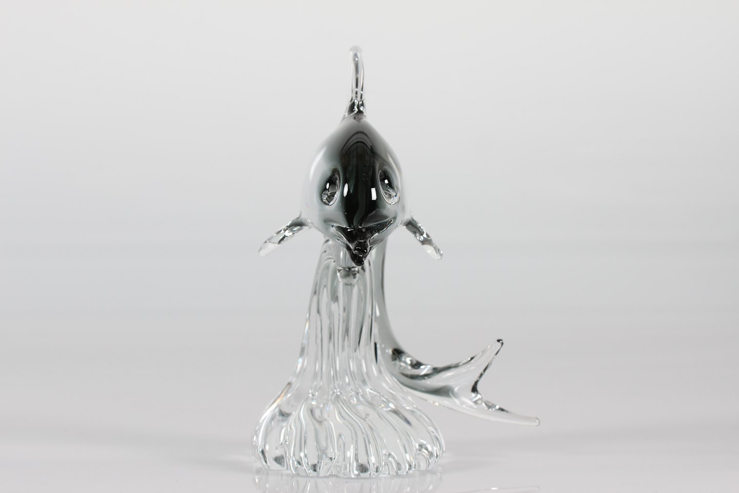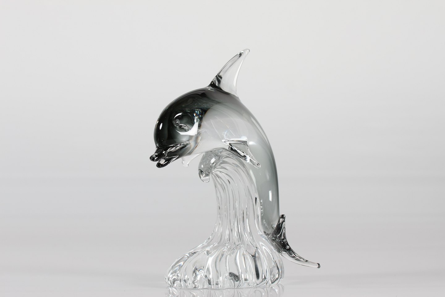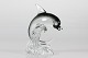 Italiensk glasfigur fra Murano Delfin der ridder på en bølge fremstillet af klar og lysegrå glasmasse Højde 24, 5 cm Meget fin stand