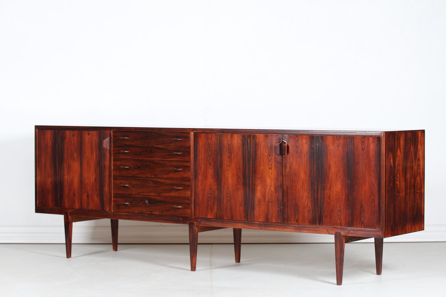 Henry Rosengren Hansen Palisanderskænk m/skuffer og hylder Producent: Brande Møbelindustri Bredde: 240 cm Dybde: 47 cm Højde: 80 cm Fin stand, klar til brug Skænken kan beses efter aftale