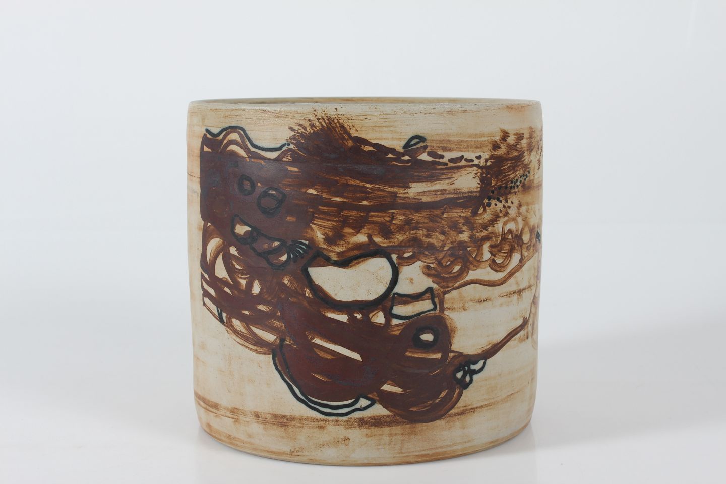 Conny Walther Stor urtepotte af stentøj med abstrakt glasur dekoration Sign. monogram for Conny Walther fra hendes eget værksted Diameter 22 cm Højde 21 cm Fin stand uden skår eller rep.