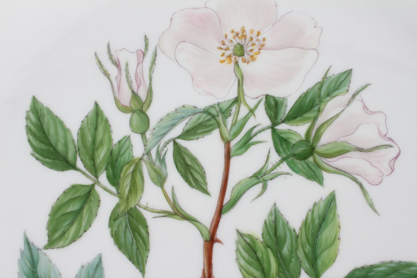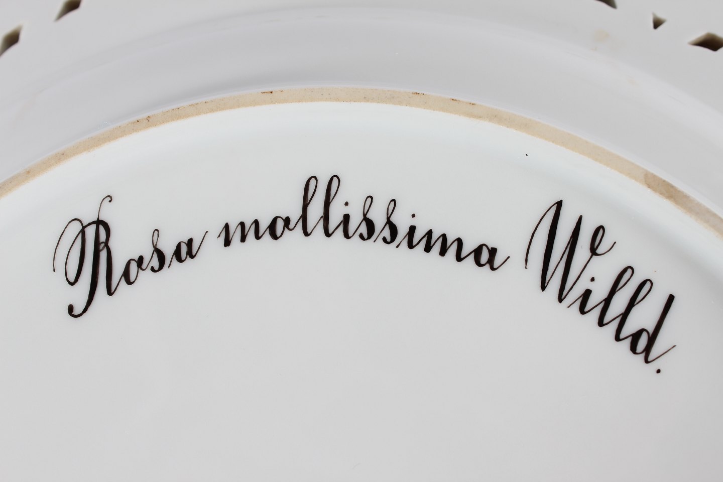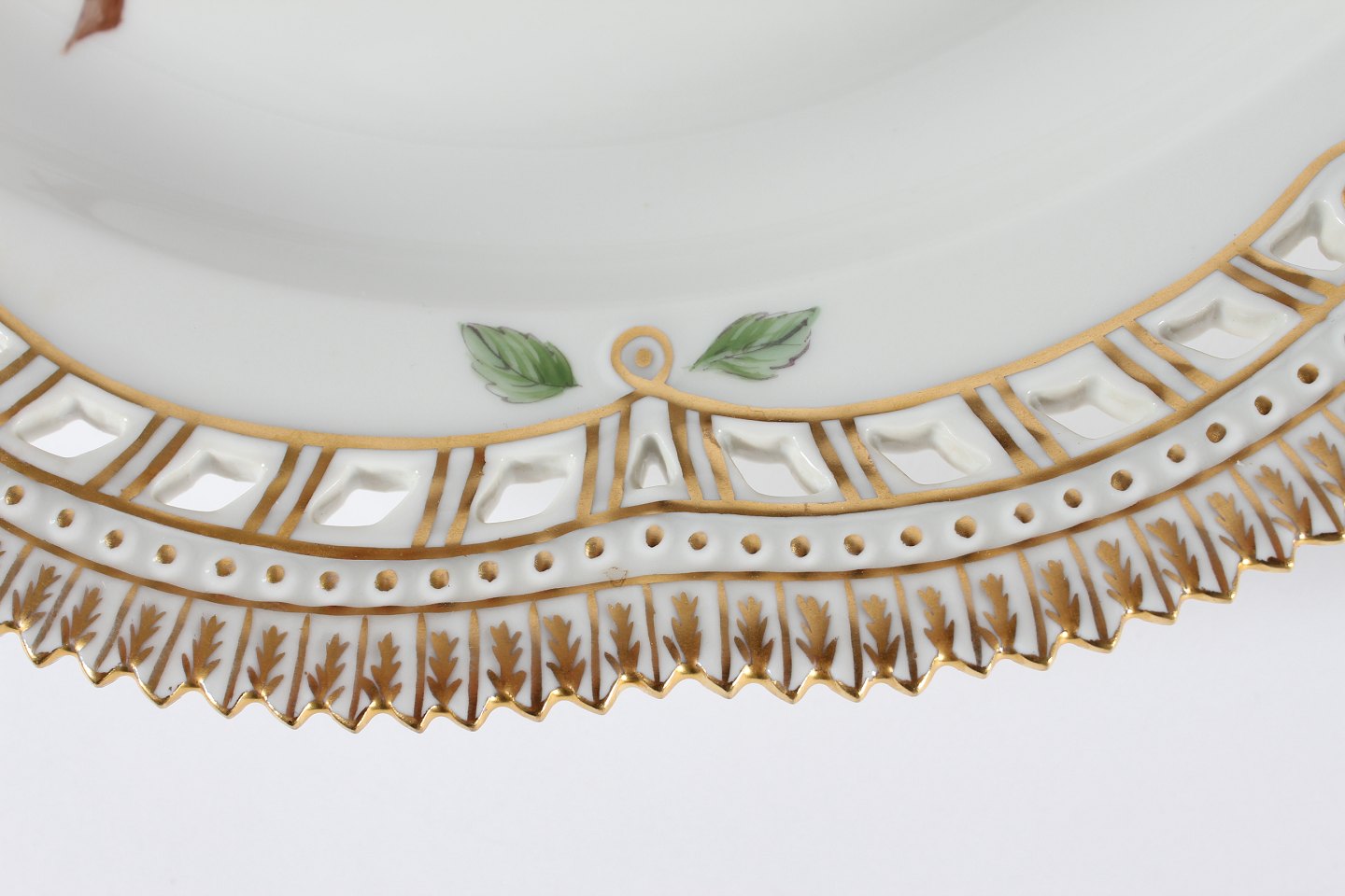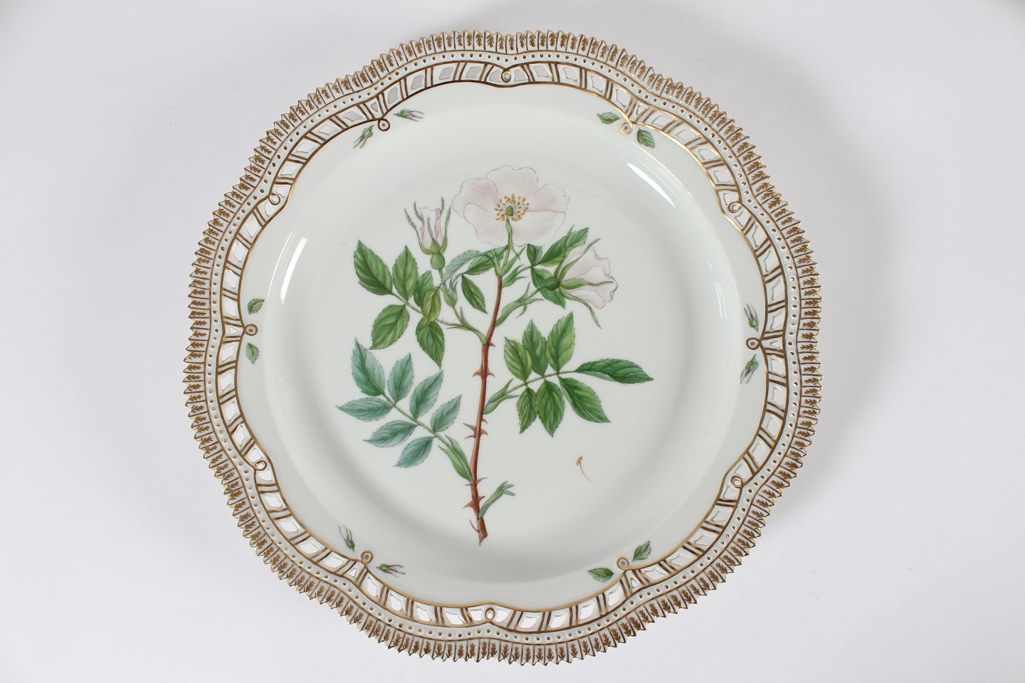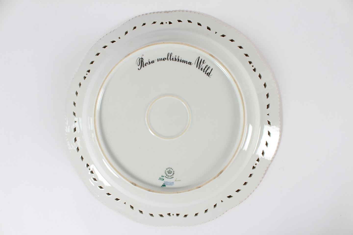 Royal Copenhagen Flora Danica Stort rundt serveringsfad nr. 20/3528 Dekoreret m/takket og gennembrudt blondekant og rosen "Rosa mollissima Wild" Med stemple fra 1966 Diameter 33 cm Fin fejlfri 1. sortering