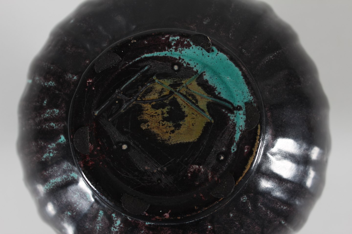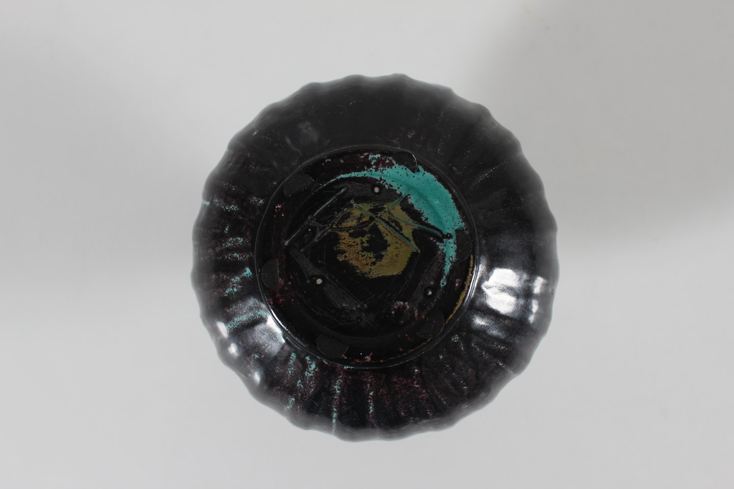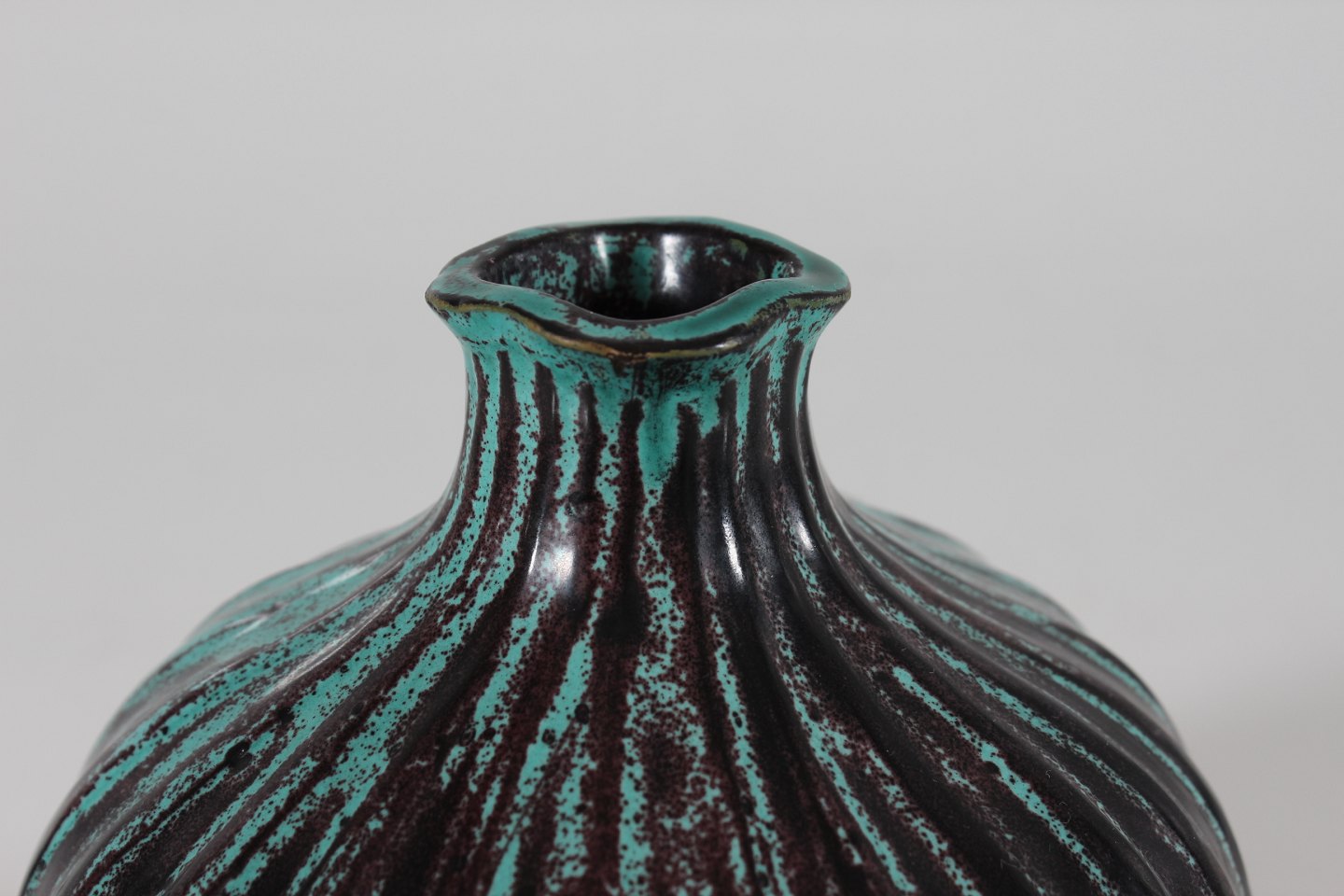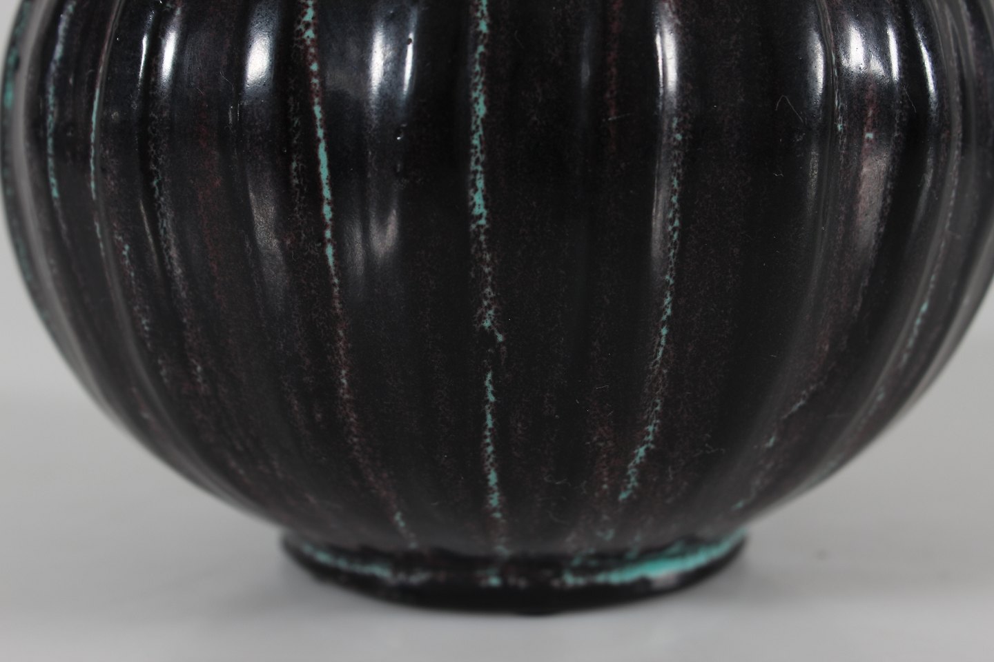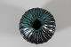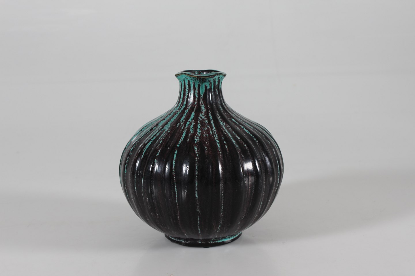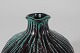 Herman A. Kähler Rund Svend Hammershøi vase i rillet stil dekoreret med blank sort og turkis glasur med noter af brunt Sign. HAK Højde 15 cm Diameter 15 cm Hel og fin stand uden skår