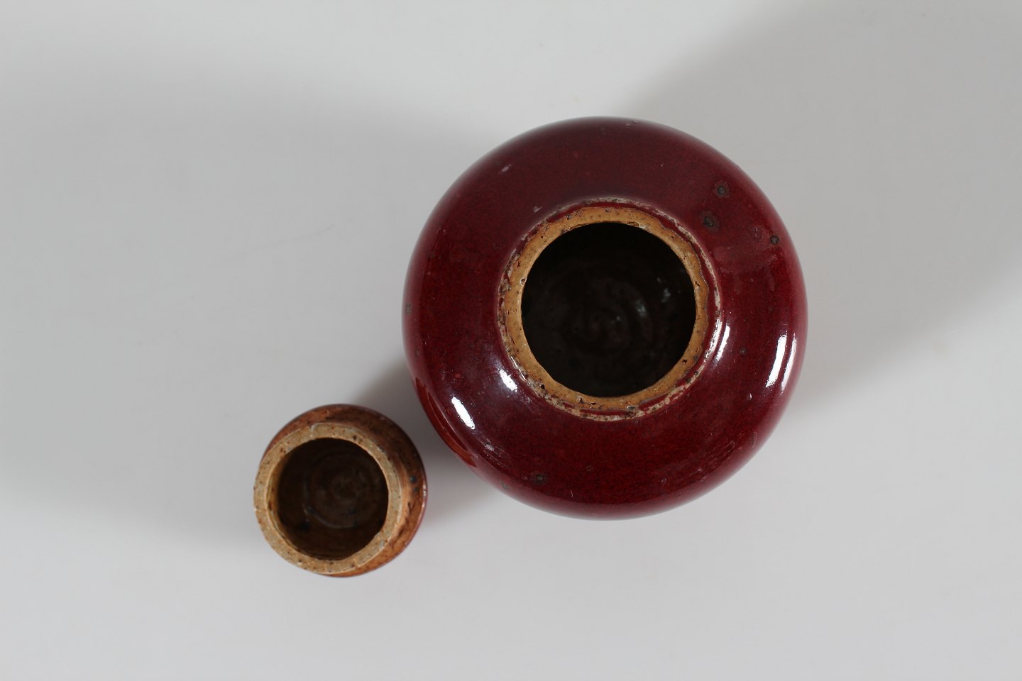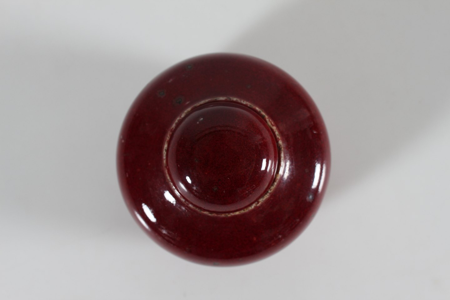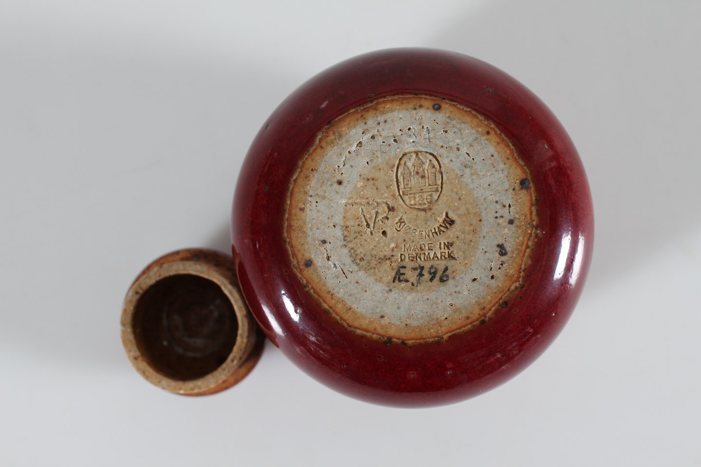 Bing & Grøndahl Valdemar Pedersen (1906-81) Sjælden ganske lille bojan af stentøj dekoreret med okseblodsglasur Med stempel fra 1950'erne Højde 8 cm Diameter 9 cm Fin fejlfri 1. sortering