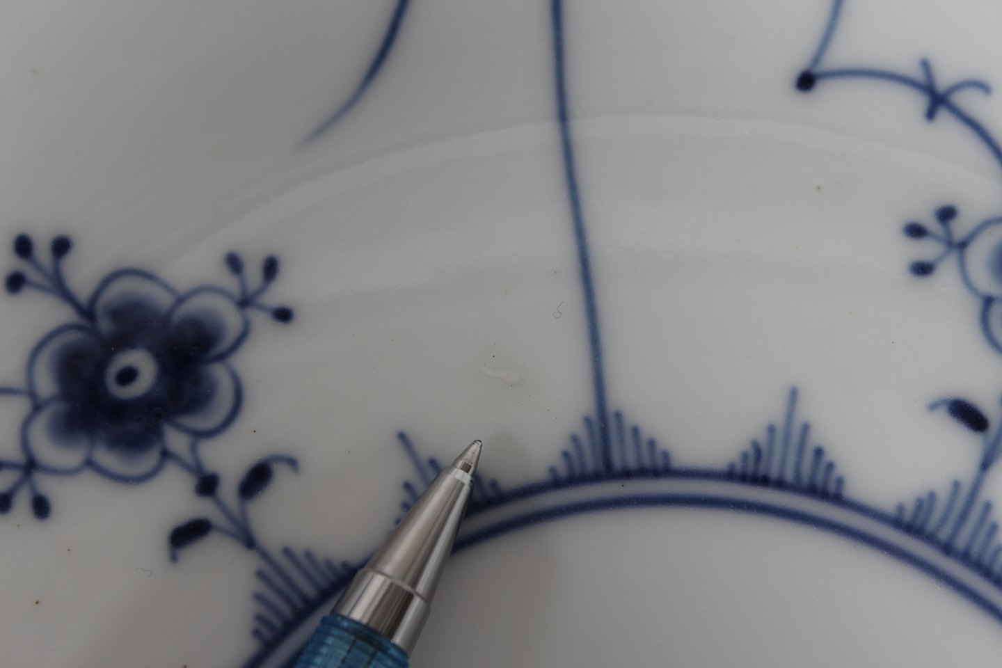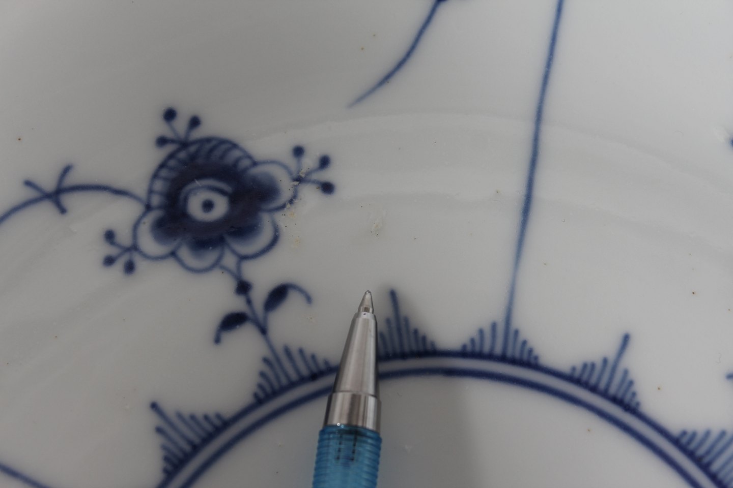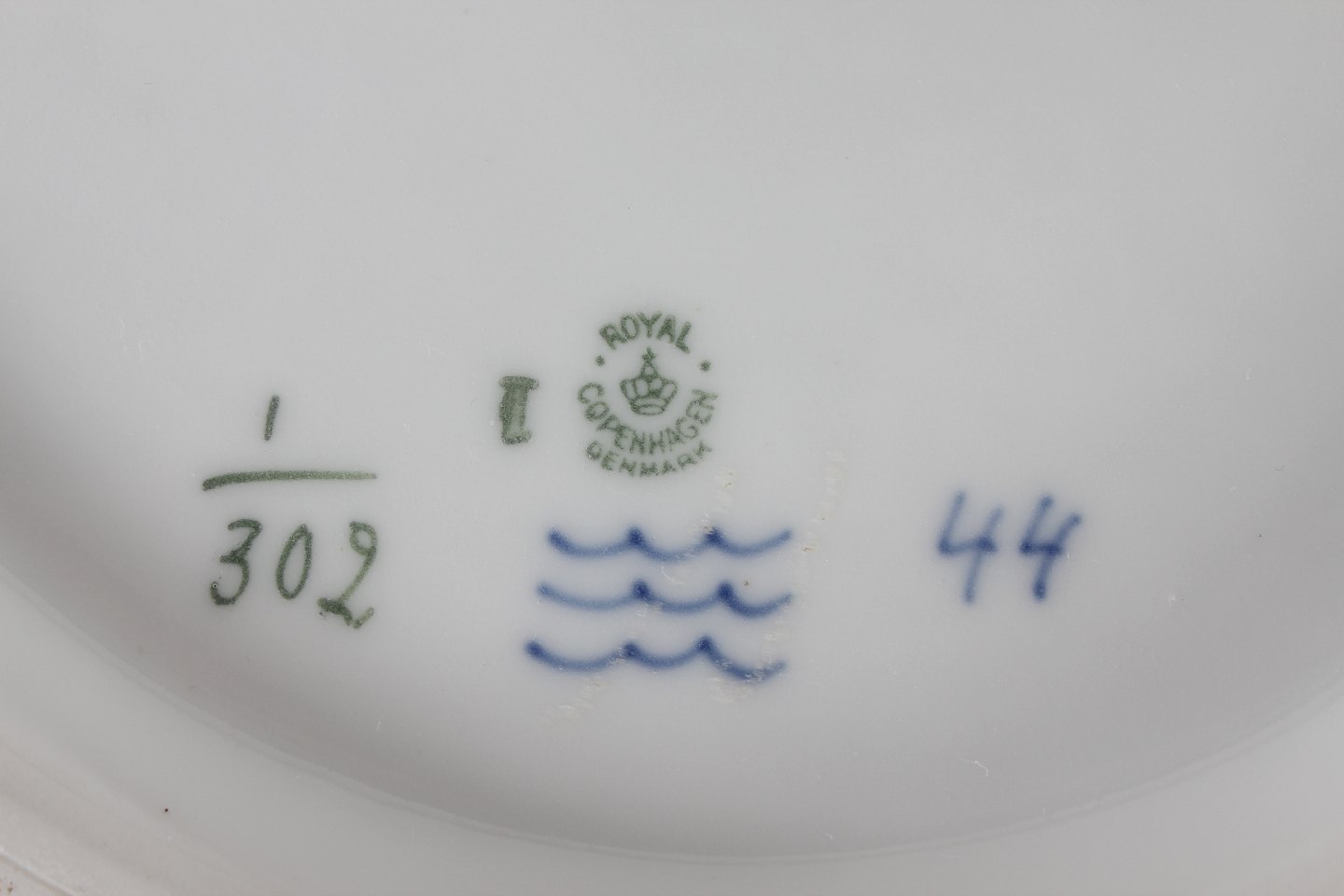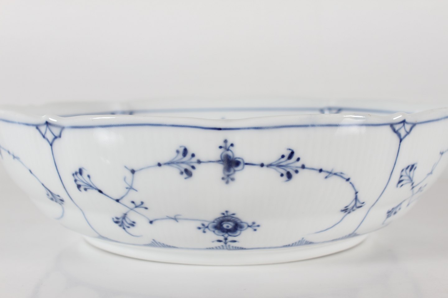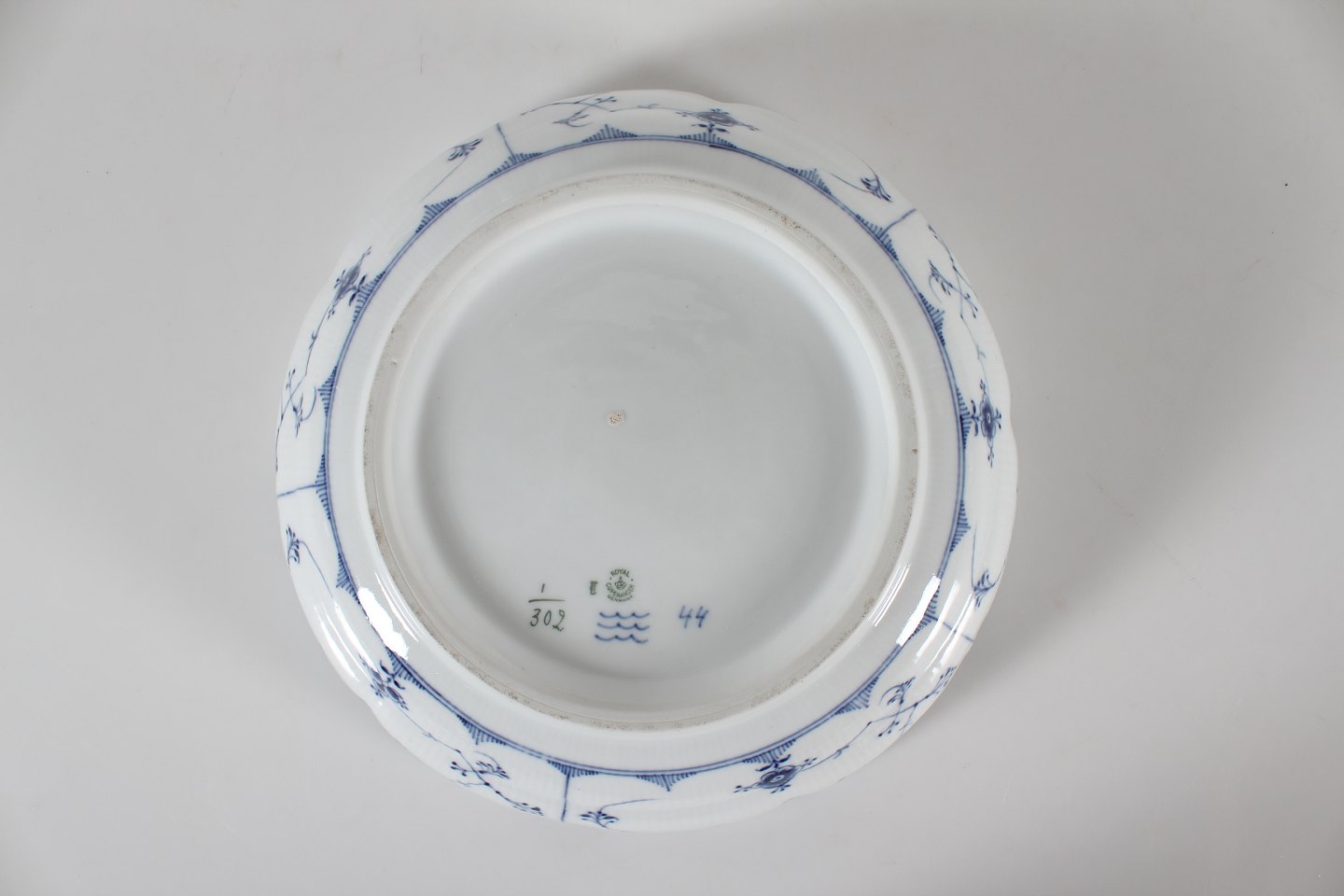 Royal Copenhagen Musselmalet Riflet Stor yderst sjælden frugtskål nr. 1/302 Med stempel fra perioden 1923-34 Diameter 30 cm Højde 8,5 cm 2. sortering - se billeder af små uregelmæssigheder i bunden