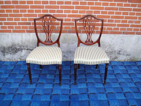 Hepplewhite 2 stk stole af mahogni med Messing sko, skjold formet ryg med udskæringer, på tilspidsede forben.