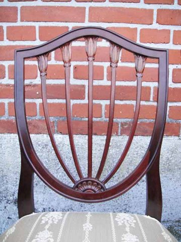 Hepplewhite 2 stk stole af mahogni, skjold formet ryg med udskæringer, på tilspidsede forben. fra Strøjers Møbelfabrik.
