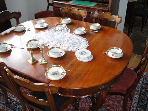 men der er kun 1 tillægsplade med sarg og 5 stole der passer til bordet + 4 andre