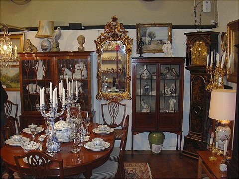 Hepplewhith Spisestue fra farre møbelfabrik Bord, 2 plader, Anretterbord, Glasvitrine 8 stole
