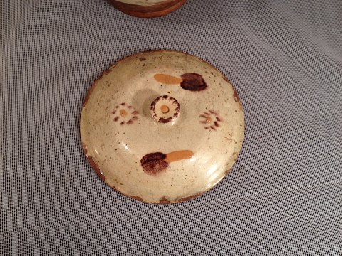 fremstår i pæn stand dog med enkelte glasurafslag på kanten af låg og kanten af potten hvor låget sættes ind.