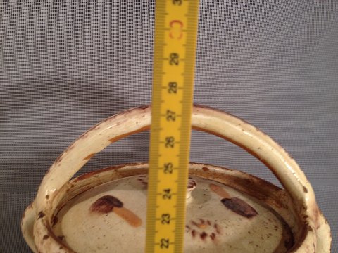 fremstår i pæn stand dog med enkelte glasurafslag på kanten af låg og kanten af potten hvor låget sættes ind.