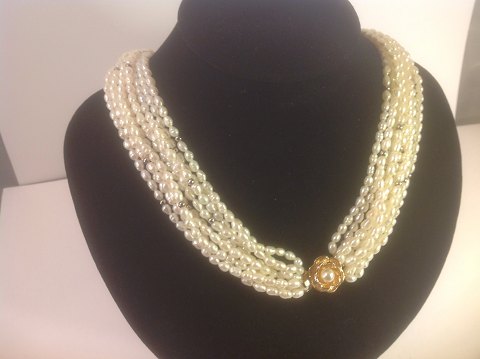 Perlecollier af ægte ferskvands kulturperler, 10- radet, dråbeformet . perler 3,8- mm, Længde ca. 45 cm, monteret med førgyldt lås i form af blomst.