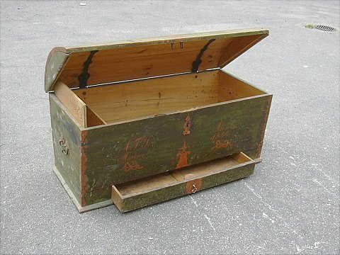 Brudekiste af fyrretræ med smedejernsbeslag, grøn bemaling, påmalet 1836.