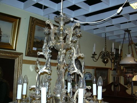 Maria Therese prismekrone Anno:1900-1920 med 8 lysarme i glas og lys i midten. dia: ø 80 cm højde: 100 cm.