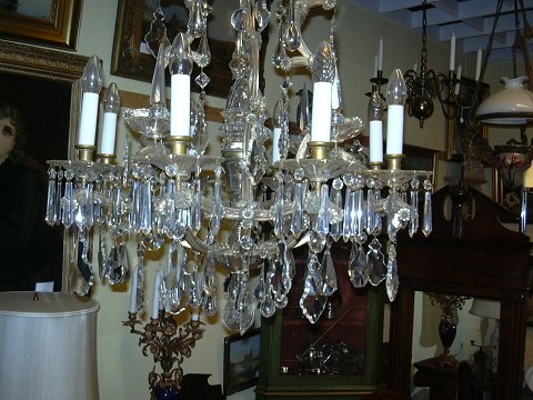 Maria Therese prismekrone Anno:1900-1920 med 8 lysarme i glas og lys i midten. dia: ø 80 cm højde: 100 cm.