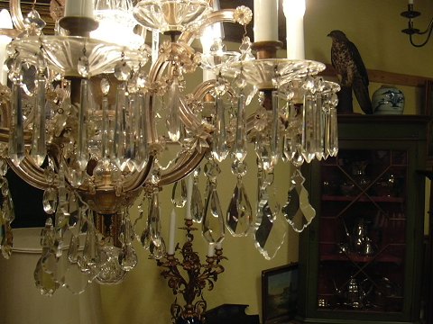 Maria Therese prismekrone Anno:1900-1920 med 8 lysarme i glas og lys i midten. dia: ø 80 cm højde: 100 cm.