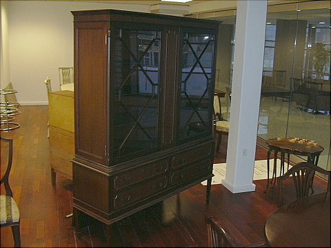 Hepple-White spisestue af mahogni. Bestående af bord L:168 cm. B:115 cm.H:76 cm., 8 stole heraf 2 med armlæn, skænk L:220 cm. D: 44,5 cm. H: 86 cm., glas vitrine L:144 cm. D: 45 cm. H: 184 cm., samt 2 plader L:50 cm. B.115 cm.