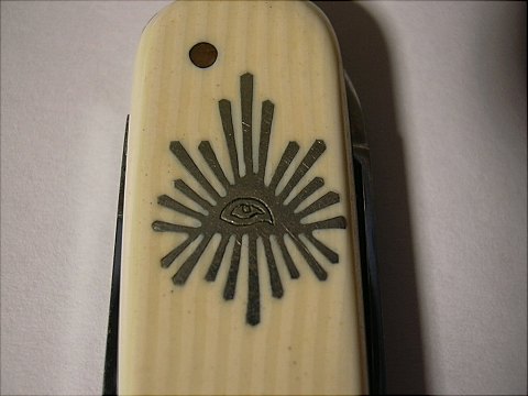 Frimurerkniv med narhvaltand og sølv symboler på begge sider.