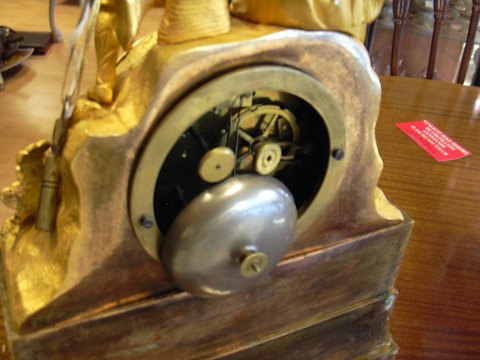 Fransk kaminur, 1800-tallet af forgyldt bronce. urhus med pige og dreng ,Skive af hvid emalje med romertal. Urskive fremstår med alderslid i emalje. H. 38 B. 27 cm.