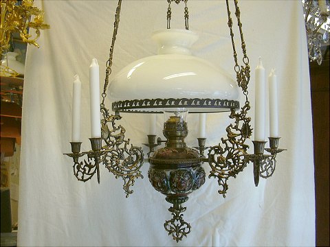 Majolika petroliumslampe stel udført i messing 6 lysarme til sterin lys