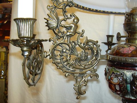 Majolika petroliumslampe stel udført i messing 6 lysarme til sterin lys