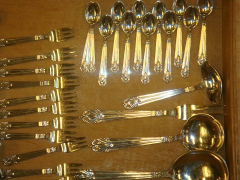12 middags knive, 12 middags gaffel, 12 Suppeskke, 12 Decertske, 12 kaffeske, 1 sovseske ,1 kompotske, 1 sovseske, 1 kompotske