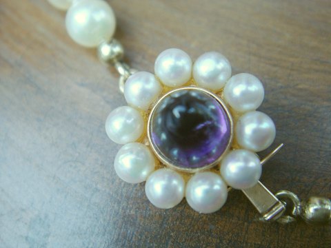 Flot Saltvands perlekæde med 14k 585 guldlås på sat små perler og amatyst længde 41,5 cm
