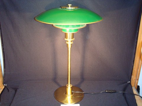 PH 3/2". Bordlampe med stame og fodstykke af , messing , monteret med grønlakerede metalskærme. skrueophæng. Udført hos Louis Poulsen