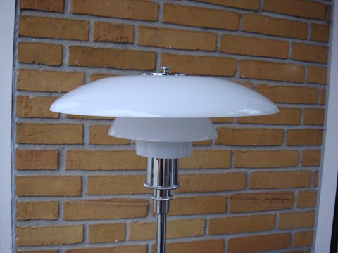 Poul Henningsen, standerlampe 'PH 4½-3½'. Fod og topplade af højglansforkromet messing, stamme af forkromet stål. Skærme af hvidt opalt glas. Fremstillet hos Louis Poulsen. Ø 45 cm, H. 125 cm.